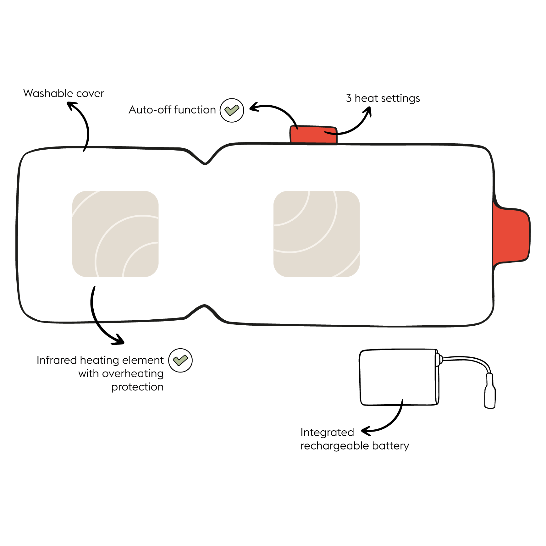 The Big Hug is a rechargeable heating pad with three heat settings. Turn on your Stoov via the smart label and choose your personal heat setting. Thanks to its powerful Li-Ion battery, you will enjoy hours of cosy warmth for up to 5 hours.